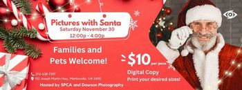 Join the SPCA and Dawson Photography for the annual Pictures with Santa on November 30 12:00pm-4:00pm at the SPCA.